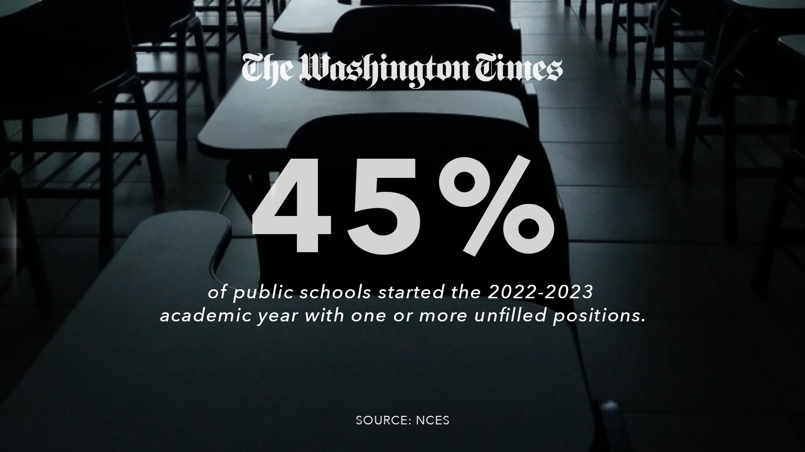 NCES reported that 45% of public schools started the 2022-2023 academic year with one or more unfilled positions. Shortages were especially acute on urban and rural campuses and in specialized subjects like math and science.