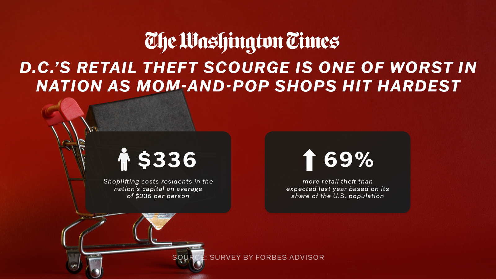 Shoplifting costs residents in the nation’s capital an average of $336 per person, according to the survey. Forbes Advisor said the District had 69% more retail theft than expected last year based on its share of the U.S. population.