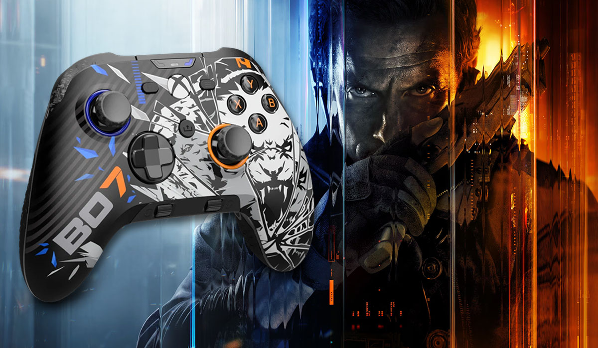 Visually, the Black Ops 7 Edition pays aggressive homage to the latest Call of Duty. The shell is stamped with the bold gray “Cerberus” emblem, baring its teeth on the right handle, and a complement of light-gray, blue, and orange accents that runs across the body and face of the controller, giving it a futuristic combat vibe.