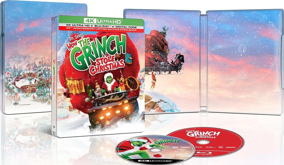 Dr. Seuss’ How the Grinch Stole Christmas: 25th Anniversary SteelBook Edition (Universal Studios Home Entertainment, rated PG, 105 minutes, 1.85:1 aspect ratio, $34.99) — Back in 2000, director Ron Howard dared to adapt a beloved children’s book and popular holiday animated TV special into a live-action spectacle that required the manic comedic might of Mr. Carrey.