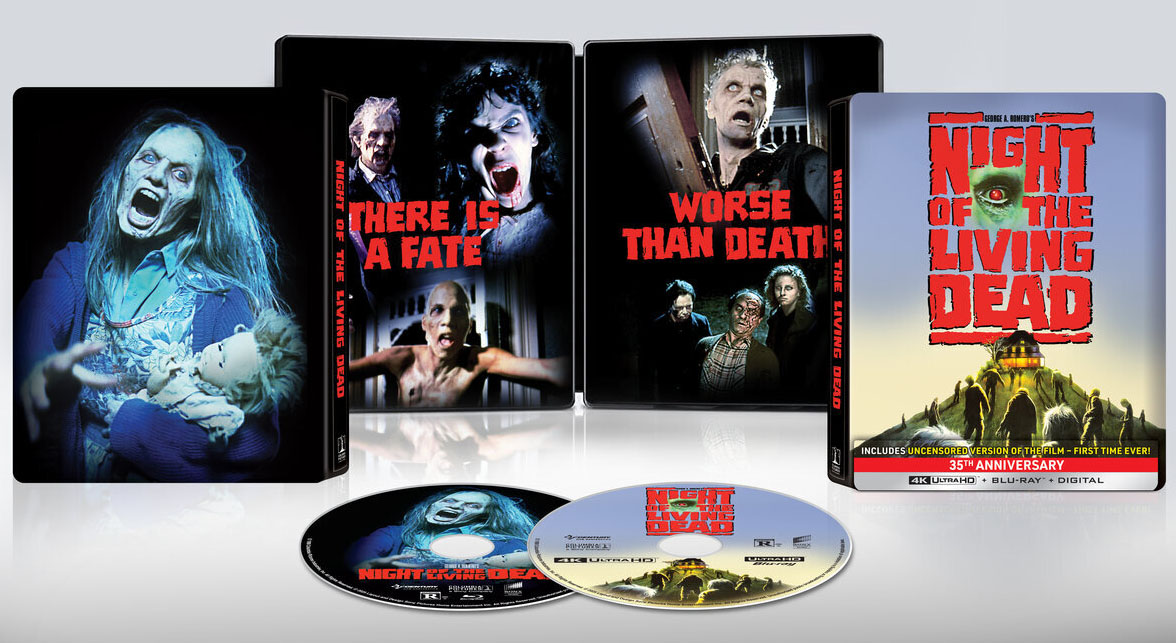 Night of the Living Dead: 35th Anniversary SteelBook Edition (Sony Pictures Home Entertainment, not rated, 1.85:1 aspect ratio, 88 minutes, $49.95) — The original zombie movie was reinvented by its creator back in 1990 and is now celebrated in time for Halloween through the UHD release encased in illustrated metal and loaded with brand new extras.